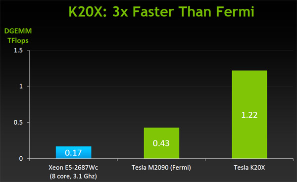 Nel confronto tra le soluzioni della famiglia Tesla basate su architetture Fermi e Kepler NVIDIA evidenzia come con le seconde sia nettamente incrementata l'efficienza complessiva, cioè la capacità di raggiungere valori effettivi di potenza di calcolo con applicazioni in ambito server che si avvicinino il più possibile a quanto messo a disposizione a livello teorico. Nel grafico sono illustrati i risultati ottenuti con due sistemi server identici fatta solo eccezione per la coppia di schede video: i valori ottenuti con Linpack, classico benchmark che misura la potenza di calcolo di CPU e GPU utilizzate in ambito di High Performance Computing, mostrano come le schede Kepler K20X siano più efficienti nel complesso, raggiungendo un valore che è pari al 76% di quello massimo teorico deducibile dalle sole specifiche tecniche.